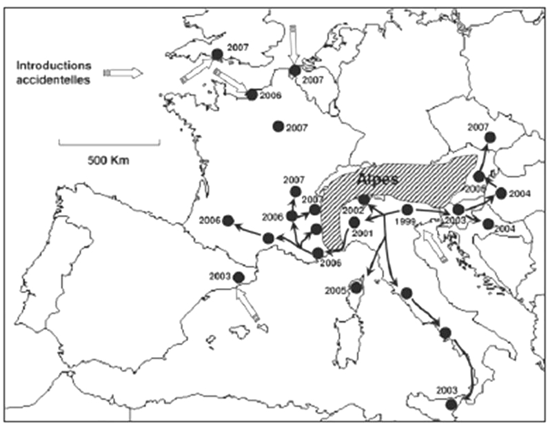 Les français ont baptisé notre bestiole sous le nom de Punaise américaine ou Punaise du pin. En effet, décrite pour la première fois en 1910, cette punaise était en quelque sorte « coincée » aux États Unis entre les montagnes Rocheuses, le désert mexicain, et la froidure canadienne. Aidée par l’homme, elle sort de cet espace limité dans les années 1950 puis colonise tout le pays avant d’arriver à New York en 1990. Dès lors la conquête de l’Europe devient prévisible, via les classiques échanges commerciaux, notamment maritimes. Les premières observations outre Amérique sont venues d’Italie du Nord (Venise 1999). Cette « tête de pont » fait tache d’huile, on la trouve rapidement dans les pays voisins. En France ont la retrouve précisément en Corse (2005) puis en région méditerranéenne continentale en 2006.