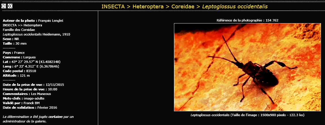 Fiche spécifique: http://www.galerie-insecte.org/galerie/fiche.php?ref=154762 Etude détaillée : http://www.insectes-net.fr/punaise/leptoglossus1.htm