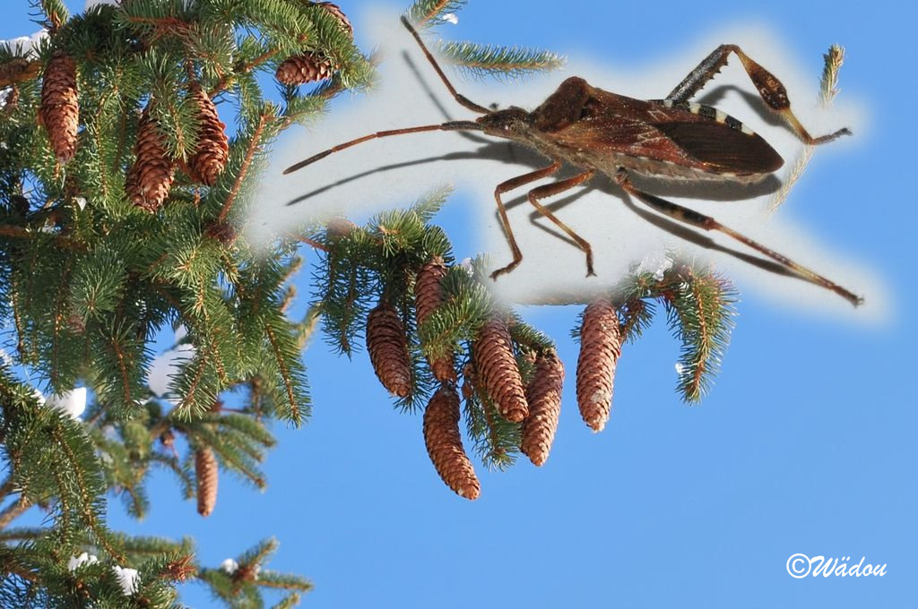 Wikipedia nous apporte un début de réponse : l’Hétéroptère constitue la famille des punaises qui se caractérise par un appareil buccal de type piqueur-suceur. Le Coreidae est essentiellement un insecte suceur de sève. Il se nourrit de cônes de conifères en cours de formation et également des graines contenues dans ces cônes.