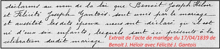 Ce sujet de la légitimité avait déjà été rencontré dans la famille , ainsi le grand père maternel de Édouard François Toussaint: Benoit Joseph Héloir s’était marié en 1806 avec Anastasie Gantois, ils avaient eu deux enfants mais Anastasie était décédée prématurément en 1811, à 27 ans. Benoit Joseph Héloir va vivre ensuite avec Félicité Gantois, sœur aînée d’Anastasie. Ils auront ensemble six enfants mais ne se marièrent qu’en 1839… en présence de leurs enfants.