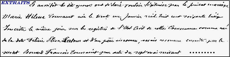 En effet, le 16 décembre 1879, le mariage officiel a lieu devant le maire de Troisvilles,…, mais à la fin de la cérémonie, les jeunes époux « déclarent vouloir légitimer Marie Helena Toussaint née le 31 Janvier 1876 …de père inconnu… »,… puis néanmoins reconnue par Édouard Toussaint … le 7 Mai 1877. C’est ainsi que l’on apprend que Félicie Latour avait eu sa première fille hors mariage à 18 ans.