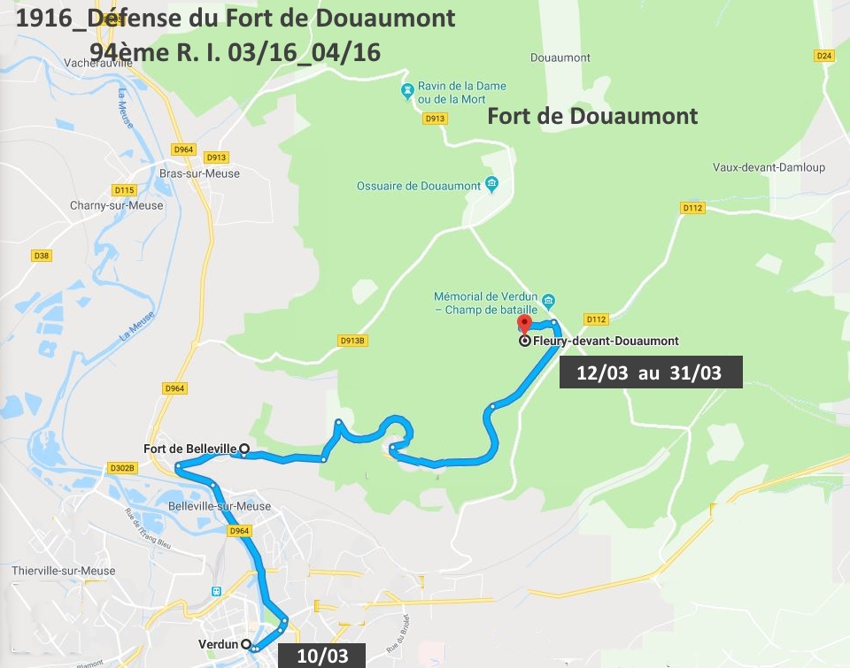 L’armée française doit maintenant stopper l’arrivée des Allemands à Verdun. De fin mars à début avril, le 94e régiment va se positionner entre le Fort de Douaumont et Verdun, et va réaménager le champ de bataille sous les bombardements allemands qui tuent chaque jour quelques soldats. En effet, il n’y a plus de tranchées; par ci, par là, se tiennent des îlots de poilus, dans des trous d’obus; pas un abri, pas un trou pour se reposer un instant. Il faut approfondir la tranchée sans retard; la consigne est de ne pas bouger, de ne pas se montrer, durant le jour, et d’utiliser l’obscurité de la nuit pour exécuter les travaux d’aménagement. Un soldat, André Joubert, décrit ainsi dans ses mémoires l’arrivée des troupes françaises en première ligne devant le Fort de Douaumont en mars 1916; « Ils n’étaient pas des néophytes du front, les hommes qui, après l’attaque imprévue du 21 février, venaient à Verdun. Ils avaient connu toutes les misères, couru tous les dangers. Ils ne connaissaient plus la peur. Ils allaient indifférents, stoïques, inconscients, comme dans un rêve… Ils étaient accoutumés. Ils étaient les survivants des meurtriers combats de l’Argonne et de l’offensive manquée de Champagne. Mais quand, à un détour de la route encaissée, dans la nuit profonde, ils purent voir plus loin que le talus, plus loin que la forêt, le spectacle indescriptible qui s’offrit les fit arrêter d’horreur. Ils étaient au centre d’une circonférence de feu, ininterrompue, circonférence d’astres éphémères où l’or se mêlait aux émeraudes et aux rubis, comme un collier précieux qui les eût enserrés. Droit devant eux, c’était le Mort-Homme et la cote 304. »