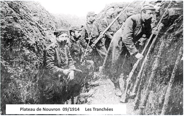 Désormais, la guerre prend un autre visage: le développement des efforts rivaux va conduire à une lutte de vitesse qui à la fin d’octobre, étirera jusqu’à la mer du Nord une ligne de feu ininterrompue. Comme un incendie qui s’étend progressivement sur la campagne, la bataille se développe ainsi des collines de Picardie aux plaines d’Artois et aux canaux des Flandres. La stabilisation du front conduira à l’enfouissement des armées adverses en deux réseaux démesurés de tranchées, étranges citadelles sinueuses dont la menace réciproque va se prolonger près de quatre années. Dès le 11 septembre, le 294e RI reprend l’offensive en direction du nord. Ayant reçu l’ordre de traverser l’Aisne, il se heurte à la résistance allemande qui bombarde régulièrement les ponts. Le 15 septembre il parvient néanmoins à traverser l’Aisne sur un pont de bateaux près de Fontenoy à l’ouest de Soissons. Du 17 au 20 septembre, il prend part à l’attaque du plateau du Nouvron et va découvrir la guerre des tranchées : dès qu’ils bougent, nos hommes sont accueillis par des feux de mousqueterie et de canonnades terribles sans pouvoir riposter. Dans cette attaque, le régiment perdra de nouveau plus de 15 pour cent de ses effectifs.