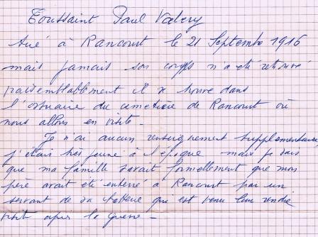Nous prenons la route de Rancourt et arrivés sur le site, mes parents se dirigent avec beaucoup d’émotion vers la Chapelle pour interroger le personnel présent. De mon coté j’aperçois tout le long de la route des boules noires rayées disposées régulièrement tous les dix mètres sous forme de monticules qui ressemblent à des pyramides. Je commence à jouer avec ces boules en les lançant et visant à distance les petites pyramides où elles sont stockées. Quelques minutes plus tard, mon père arrive affolé, en courant et me distribue immédiatement une belle paire de gifles: les fameuses boules noires étaient des grenades que le personnel du cimetière ramassaient encore très régulièrement sur le site et qui étaient loin d’avoir toutes été désamorcées. Au retour de cette sortie, ma mère écrira le mot ci-joint sur lequel on peut lire « Toussaint Paul Valery… jamais son corps n’a été découvert vraisemblablement il se trouve dans l’ossuaire de Rancourt… »