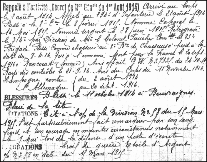 Il sera décoré de la Croix de Guerre avec Étoile d’Argent. Il sera ensuite nommé caporal le 16 Mai puis sergent le 28 Juin