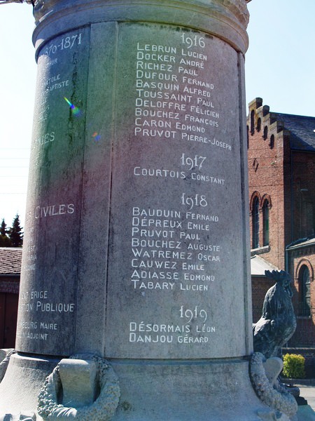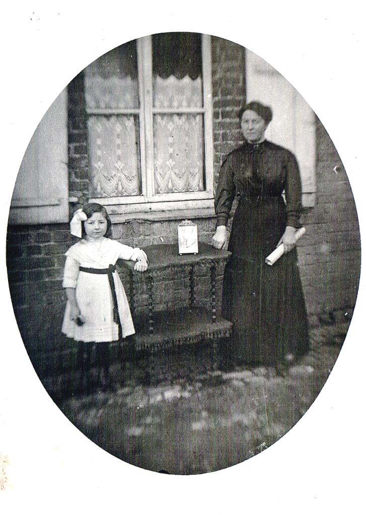 Pour rendre hommage à son mari, ma grand-mère Marie Victoire Toussaint fit réaliser une photo en face de la boulangerie avec sa fille Gisèle (ma maman) et entre elles la photo de Paul Toussaint décoré de la Croix de Guerre posée sur une table. Le projet de boulangerie vient de s’effondrer. Ma grand-mère revendra la boulangerie à la fin de la guerre, se remariera en 1919 et, suivant son mari, s’installera à Bertry où sera éduquée sa fille Gisèle, ma mère.