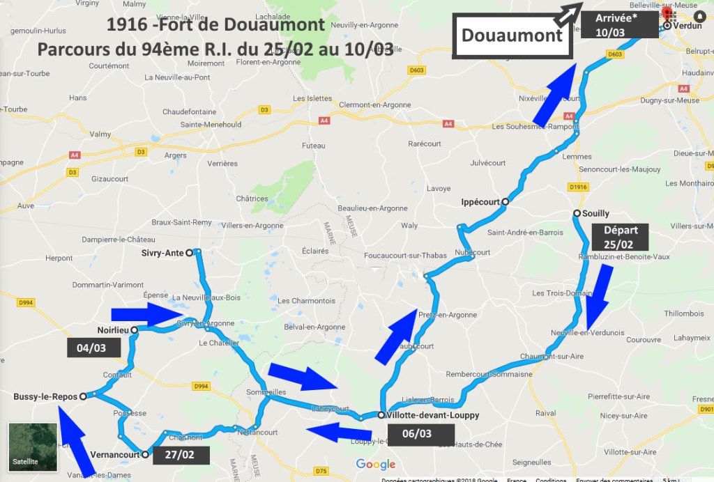 Le 25 février, le 94e RI est au repos à Souilly à 20 km au sud de Verdun. Il reçoit un nouvel ordre de marche pour se diriger vers le Sud Ouest. Les communications sont rendues très précaires. Où se produira l’effort décisif de l’adversaire? Une seule certitude, c’est au point le plus menacé que le régiment expérimenté devra aller pour défendre sa petite patrie.