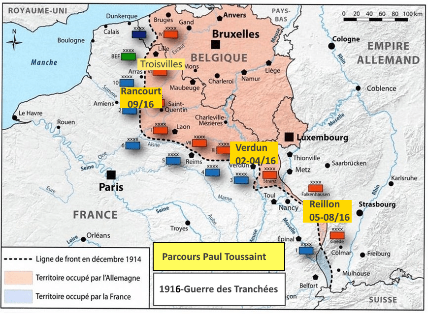 Aout-Septembre 1916, la bataille de la Somme: Rancourt. Paul Toussaint tué au combat le 20 septembre 1916.