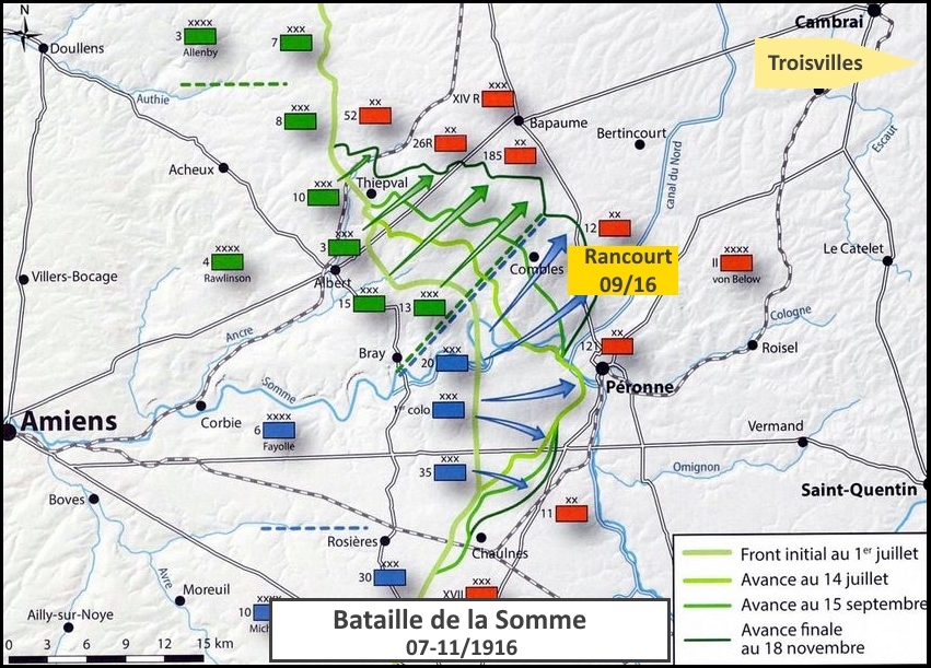 Des combats intensifs vont se prolonger devant Rancourt et, le 26 septembre enfin, fut une journée glorieuse : les Armées anglaises et françaises se donnaient la main dans Combles, le principal pilier de la défense allemande, la « clef » entre Bapaume et Péronne.