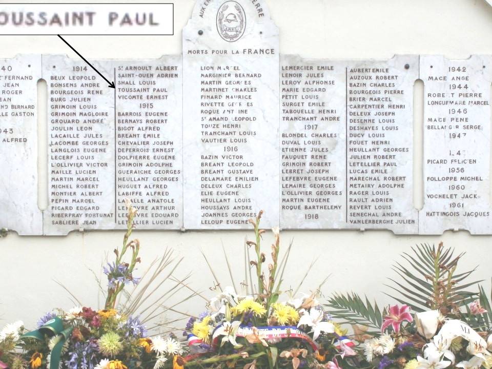 Quelques semaines après, la nouvelle du décès de Paul Toussaint parviendra à sa famille à Troisvilles sous la forme d’un simple document écrit par le Corps d’armée ainsi qu’à son père Edouard, son frère ainé Edouard et sa sœur Elvina qui viennent de fuir la zone occupée et la misère: ils ne sont plus en mesure d’exercer leur métier de tisserands à Troisvilles et sont venus se réfugier à Saint Pierre-lès-Elbeuf pour tenter de retrouver du travail dans l’industrie textile (4) . C’est ainsi que le nom de Paul Toussaint figure aussi bien sur le monument aux morts de Troisvilles que sur celui de Saint Pierre-lès-Elbeuf