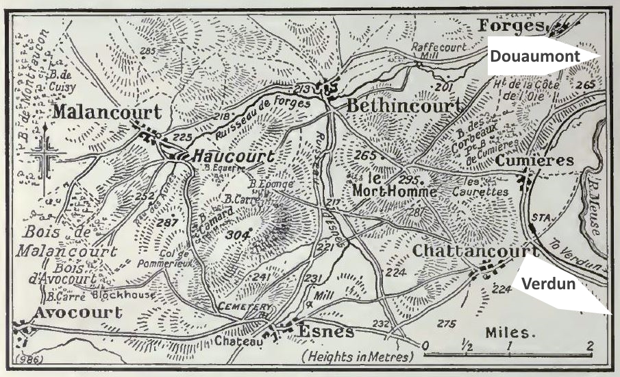 La 42e division est évacuée progressivement du 13 au 15 avril. Elle est relevée par la 40e D.I.Le 7 mai, après une période de repos et de reconstitution du bataillon à Bar-le- Duc, le 8e B.C.P. est de retour sur le front de Verdun et se positionne à droite du Mort-Homme, jusqu’au 18 mai. Rien à signaler sauf la canonnade d’une violence inouïe, qui termina le séjour du bataillon : il était tombé près de 5.000 obus sur un espace très restreint.