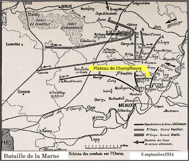 A noter que c’est au cours de la journée du 7 septembre que se déroule le fameux épisode des taxis de la Marne : 600 taxis vont au départ de Paris faire dans la nuit deux aller-retour pour amener sur le champ de bataille la 7e division avec 5 hommes par taxi.