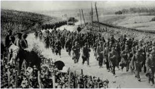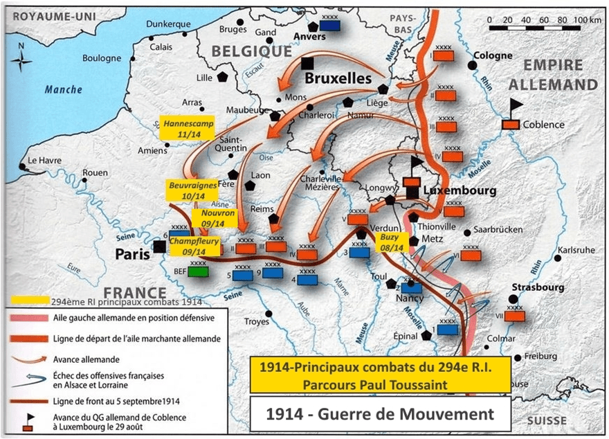 C’est à pied sous une chaleur accablante que le régiment se dirige vers Verdun puis à l’est vers Metz, parcourant plus de 15 km par jour. Les premiers jours, les combattants français sont confiants : les rumeurs annoncent que la France n’est pas isolée, l’Angleterre et la Russie la soutiennent dans le cadre de la triple alliance alors que, chez les adversaires, dans le cadre de la triple entente, si l’Allemagne et l’Autriche-Hongrie restent alliés, l’Italie se déclare neutre.Mais l’inquiétude va vite s’installer: les Allemands auraient envahi la Belgique.Dès le 22 aout, on entend les bruits d’une violente canonnade à 25 ou 30 km: les Allemands essaient de pénétrer en France en traversant la vallée de la Meuse. Le 25 aout ont lieu de violents combats à Buzy mais le 294e régiment reste en réserve et n’y participe pas directement. En fin de journée, les français ont fait plus de trois cents prisonniers allemands et le 294e régiment est chargé de les garder. C’est ainsi que Paul Toussaint va découvrir les atrocités commises par les allemands et les premiers champs de bataille: un vieux français fuyant les zones de combat raconte comment les allemands l’ont attaché sous un canon; pendant le tir, il recevait un coup de sabre chaque fois qu’il se plaignait. Sur le champ de bataille, le spectacle est horrible. Les malheureux soldats blessés et morts gisent à même le sol…près du passage à niveau, les Français sont groupés…à cinq cent mètres, les cadavres allemands dispersés. Un sous lieutenant français est figé, le bras tendu, brandissant une épée, couché sur le coté comme un soldat de plomb.