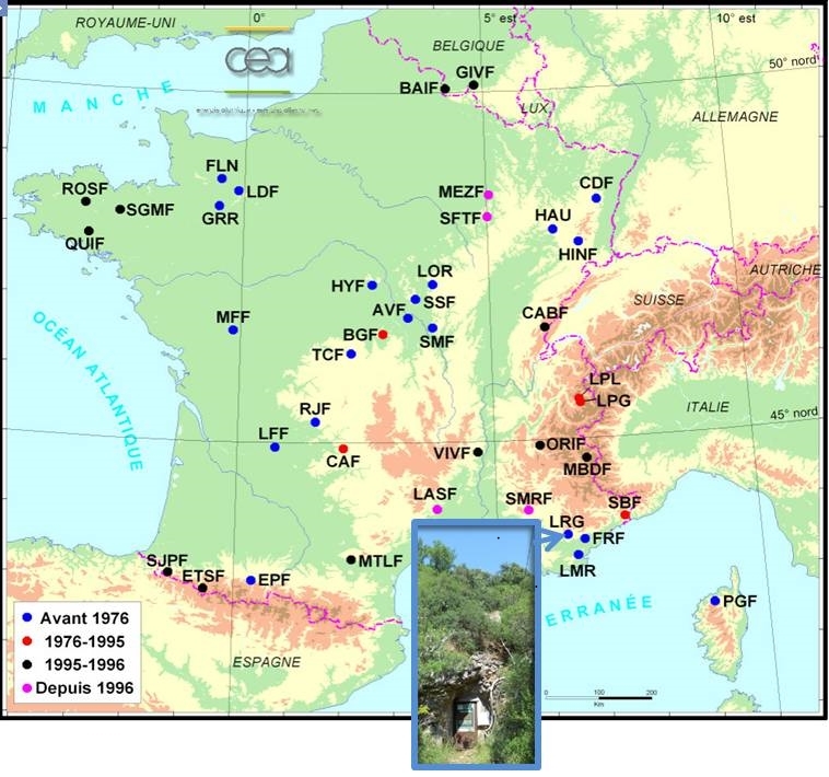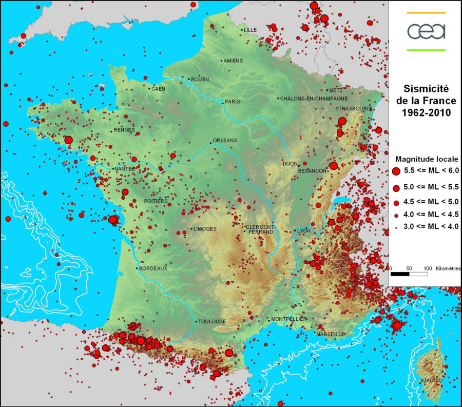- 1975, le lancement du programme français de centrales nucléaires conduit l’E.D.F., le ministère de l’industrie, le Bureau de recherches géologiques et minières (BRGM), et, le LDG à réaliser une carte sismotectonique de la France. Cette carte rassemblera les données connues sur les structures géologiques (failles et volcans, notamment), et permettra de confronter l’histoire sismologique et tectonique avec les évènements enregistrés en particulier par le réseau LDG. Elle servira de base aux études d’implantation des centrales nucléaires sur des zones à faible risque sismique.