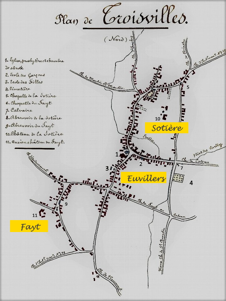 —La vie de nos ancêtres: Au XIème, nos ancêtres vivent encore sous un régime féodal. Pour le décrire, il suffit de revenir sur l’origine du nom du village de Troisvilles où naquit ma mère Gisèle Toussaint en 1912 : il est le résultat du regroupement de trois « villas » : la Sotière, le Fayt et l’Euvillers.