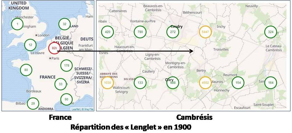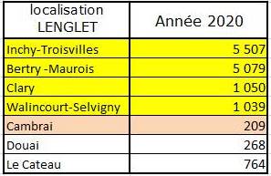 Les données détaillées de 2019 montrent bien l’origine des Lenglet dans les villages de Inchy, Bertry, Clary, Walincourt…. et leur absence historique presque totale dans les villes comme Cambrai, Douai, Le Cateau…