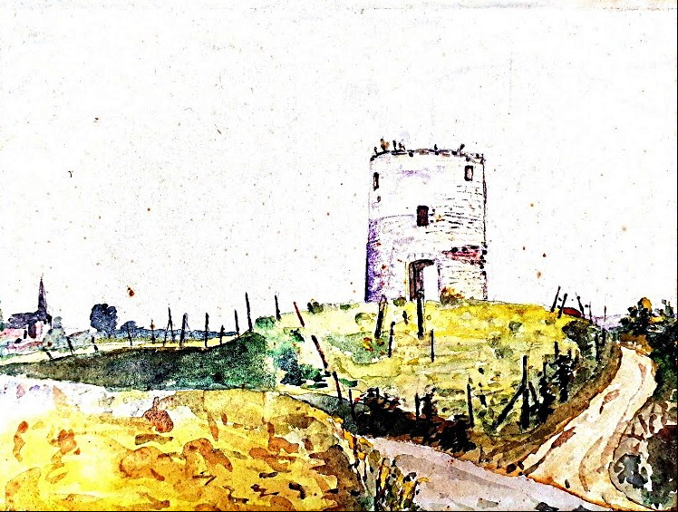 Nous arrivons en 1938, mon père François Jules Désiré Lenglet est enseignant à Merville dans la région de Lille. Il est très attaché à sa région d’origine et vient chaque année passer toutes ses vacances à Troisvilles pour retrouver sa famille et son jardin. Un jour de détente, il prend ses aquarelles et son pinceau et va croquer le Moulin de Pierres en ruine et son environnement. Ce dessin sera encadré et accroché en bonne place dans son bureau.