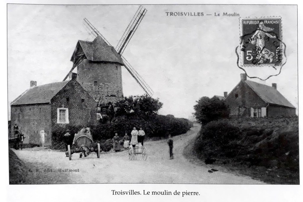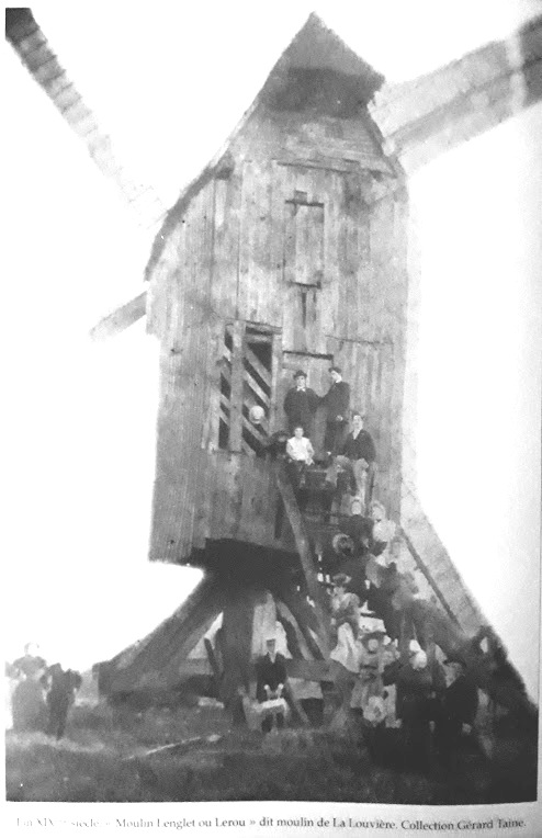 Les lois féodales ont donc disparu et le nombre de moulin va croître rapidement, c’est ainsi que en 1809, on recensera 202 moulins dans le Cambrésis dont 22 moulins à eau avec roue perpendiculaire et surtout 151 moulins à vent. Dans le seul secteur de Troisvilles, on comptera 3 moulins à Honnechy, 3 à Reumont et 6 à Troisvilles. Un de ces moulins était appelé le moulin de « La Louvière « également dénommé moulin Lenglet (voir première photo), situé à proximité du chemin de Bertry sur le territoire du Petit Troisvilles, Ce moulin est érigé pendant la période révolutionnaire. Au début du XVIIIe siècle, il est occupé par Louis Langlet ou Lenglet, meunier originaire de Reumont, puis après son décès en 1806, il est repris par son fils Antoine-Joseph Lenglet . Nul doute que ce Lenglet était un de nos cousins éloignés.