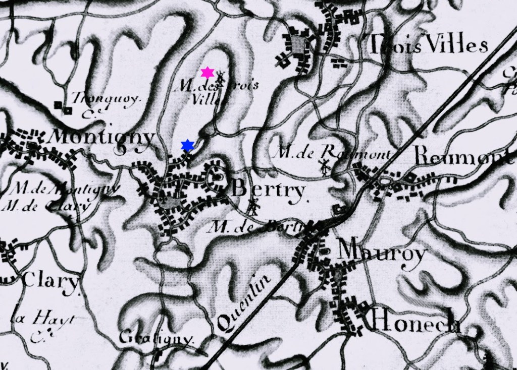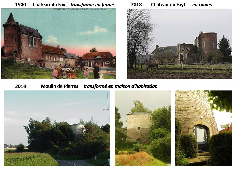Nous voici en 1756 à Troisvilles, dans le Cambrésis, Marie-Désirée d’Esclaibes, Dame d’Amerval et du Fayt, perd son mari Messire Michel-Joseph Muxica de la Torre-Button, seigneur du Fayt. A cette époque, elle vit au Fayt, dans un élégant château qui comporte une tour élégante, une salle immense capable de recevoir 250 personnes et un escalier souterrain secret conduisant à la chapelle de Notre Dame de Tongre voisine. Il a été bâti sur les ruines d’un château féodal qui comportait un donjon en pierre que l’on appelait le château De La Tour et dont l’existence est attestée dès 1096. Elle décide de faire bâtir sur son terrain près du chemin conduisant au village voisin de Reumont, un moulin à vent en utilisant les pierres du donjon en ruine. Ce moulin portera très bientôt le nom de moulin « Des Pierres ».