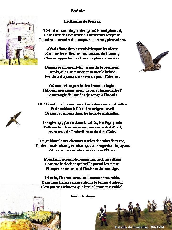 Arrive la révolution française de 1789. Le Moulin des Pierres va jouer un rôle clef dans la triste bataille de Troisvilles qui va opposer le 24 Avril 1794 les troupes républicaines françaises aux troupes alliées : autrichiennes et anglaises décidées à rétablir la royauté en France. Le chef des troupes anglaises, le duc d’York et celui des troupes autrichiennes, le F.M.L. Otto vont gravir la tour du moulin pour tenter d’observer les mouvements des troupes adverses. Le F.M.L. Otto relate « Je montai sur le moulin à vent (de Troisvilles) et Son Altesse Royale eut la bonté de me donner une bonne lunette « . C’est ainsi qu’il va pouvoir suivre à distance les troupes françaises et établir la stratégie qui leur permettra de les battre sévèrement. Les « de la Torre », seigneurs du château du Fayt seront contraints d’émigrer et la propriété du moulin va devenir l’enjeu de rivalités entre citoyens français. Ainsi, en 1802, un certain Etienne Taisne avertit le Préfet afin de posséder « une demi mencaudée de terre et un moulin à vent à bled y bâti, situé à Trois Villes et provenant des héritiers de la Torre émigrés… »