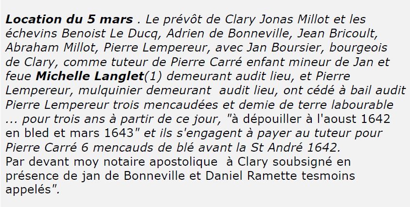Ce « contrat de mariage » nous montre que Pierre Lenglet réside au hameau de Hurtevent-les-Clarÿ et Caullerÿ et nous incite donc à nous plonger dans les archives de Caullery, village voisin de Clary