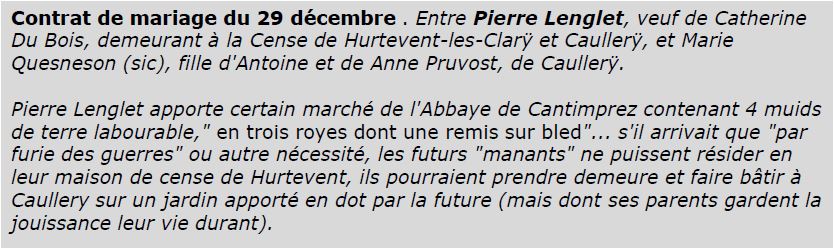 L’Histoire de Caullery apporte quelques précisions à ce contrat : « En 1692, Pierre Lenglet, qui demeure en la cense de Hurtevent-lez-Clary, épouse Marie Quennesson, une des filles de Antoine Quennesson échevin de Caullery depuis 1677. Il apporte en dot avec le marché de l’Abbaye de Cantimpré, qu’il occupe, « soit 4 muids de terres labourables en 3 royes, 4 chevaux, 2 vaches, 1 omaille. Marie Quennesson reçoit de ses parents 240 florins en argent, ainsi qu’une part de leur maison et jardin à Caullery, »jusqu’à des cheriziers qui sont des sauvagiers » que les parents se réservent,…. Sur ce jardin, »les futurs pourront bâtir, pour y résider, s’il arrivoit que par furye des guerres ou autre nécessité, ils ne puissent résider à leur maison de cense de Hurtevent », elle précise que « c’est avec la soeur de Pierre Lenglet que Pierre François Mairesse se maria en 1700 »