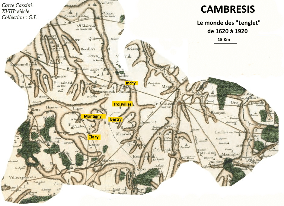 Le monde aussi avait une autre dimension, car pendant près de trois siècles, c’est dans un petit rayon de 15 km que nos ancêtres vont vivre: dans le Cambrésis entre Cambrai et Le Cateau dans les petits villages de Montigny à Inchy en passant par Clary, Bertry et Troisvilles.