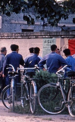 Elle profita de cette sortie pour nous faire découvrir le Pékin pittoresque de fin 1978. Dans les rues étroites du vieux Pékin, nous allons retrouver ces hautes bicyclettes noires, dont des dizaines de millions d’exemplaires sillonnent le pays, et les thermos multicolores de toutes tailles, indispensable accessoire sans quoi un Chinois ne saurait vivre. Des vieilles femmes au guidon de lourds tricycles sur quoi s’entassent d’invraisemblables quantités de marchandises, balayeurs s’acquittant sans hâte de leur tâche, boutiques où chacun prend son temps. Car le Chinois de 1978 est lent: lent à pied : il va à pas comptés, les mains croisées derrière le dos ; lent à vélo et sachant tirer parti de la moindre descente pour passer en roue libre ; lent au volant du car, du camion ou du taxi.