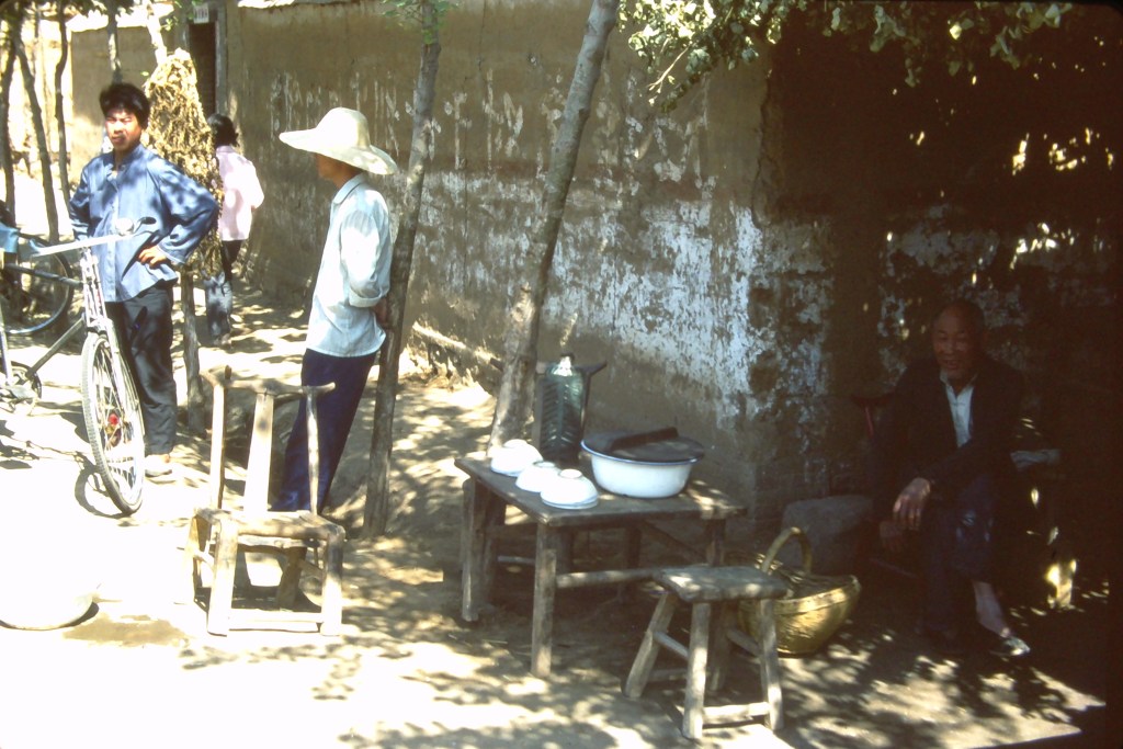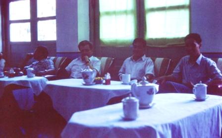 Le midi, nous prenions le repas sur place avec une table par délégation, pour huit à dix convives. Le rituel était là aussi bien spécifique: la table était ronde avec un immense plateau tournant au centre de la table sur lequel était placés tous les plats chauds ou froids qui seraient servis au cours du repas. La disposition des invités était elle aussi obligatoire: un chinois était placé à coté de chaque occidental, à charge pour lui de faire tourner le plateau central et de servir les différents mets dans l’assiette de son invité… ainsi les chinois honoraient leurs invités mais, surtout, garantissaient l’absence d’oreilles indiscrètes. Le couvert est dressé : bol, assiette, baguettes et verre, bouteilles de bière et de soda-orange. Nous apprendrons qu’on ne boit pas de thé en mangeant, et que, surprise à déclencher les fous rires, qui demande de l’eau se verra gratifier immanquablement d’une rasade d’eau… bien chaude ! Le chef de notre délégation nous rabâchera longtemps cet épisode.