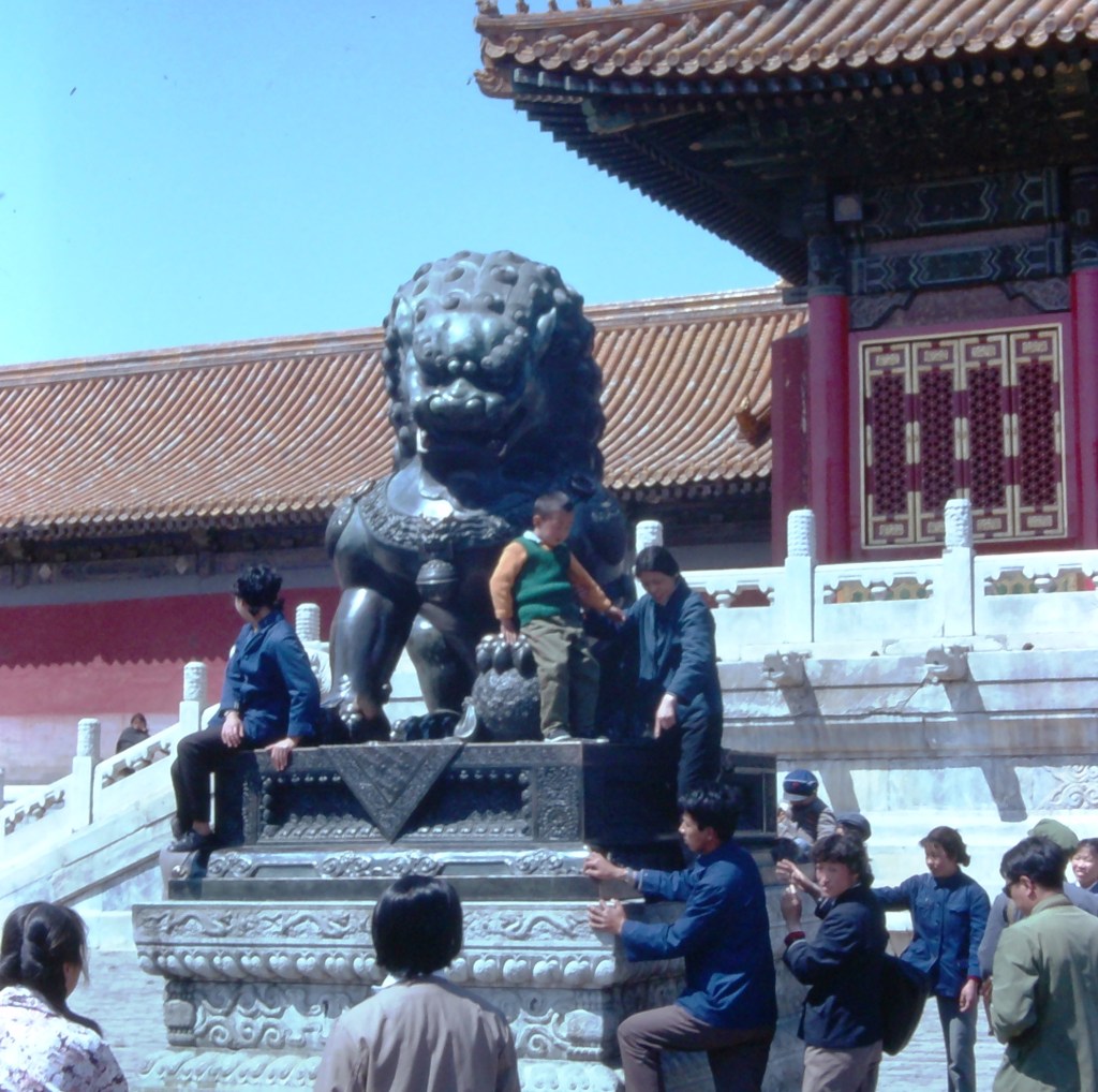 C’étaient : des bicyclettes par milliers, des autobus à soufflet, quelques camions, des escouades de piétons, des soldats bombant le torse face à l’objectif du photographe ambulant, le portrait géant de Mao regardant, de la porte commandant la Citée Interdite, le mausolée où repose Mao. Nous resterons des heures dans le palais impérial de 72 hectares, Le palais est plutôt dénommé la Cité Interdite, c’est un autre monde avec ses marbres, ses ors, ses céramiques vernissées, ses plafonds peints, ses lourdes vasques de bronze, ses animaux fabuleux, ses galeries aux colonnes couleur de sang de bœuf.