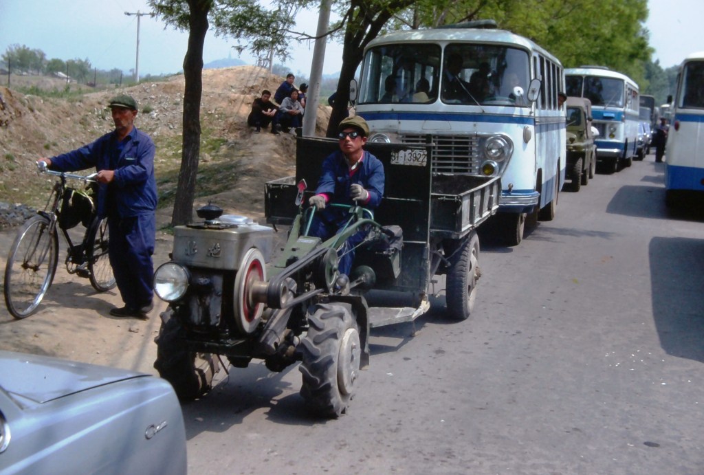 Enfin, la circulation automobile n’a rien à voir avec celle de l’occident: le transport se fait exclusivement en autobus, les quelques rares limousines ont une allure très soviétique et sont réservées aux dirigeants du parti communiste et aux visiteurs étrangers, les tracteurs et leurs remorques, de nombreux cyclistes circulent même sur la route de l’aéroport.