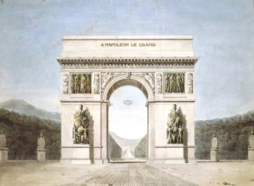 Napoléon est sacré empereur des français en la cathédrale Notre Dame de Paris le 2 décembre 1804. Au lendemain de la victoire d’Austerlitz (2 décembre 1805), dans sa proclamation à ses soldats, Napoléon écrit : « Je vous ramènerai en France. Vous ne rentrerez dans vos foyers que sous des arcs de triomphe ». La promesse sera tenue, la décision officielle de construire cet arc de triomphe, sera prise le 18 février 1806. De nombreuses discussions vont suivre sur l’emplacement du monument puis, sur son architecture.