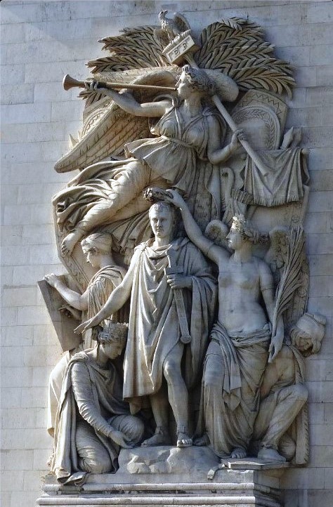 Finalement en 1830, Louis Philippe devenu roi de France relancera les travaux et soucieux de réconcilier les français avec leur histoire, consacrera l’Arc non seulement à la seule Grande Armée, mais à toutes les campagnes françaises de 1792 à 1815. On retrouve donc Napoléon dans deux des quatre grands haut-reliefs qui évoquent quatre dates, correspondants à un moment de consensus national : la République (Départ des volontaires), l’Empire (le Triomphe de 1810 et la Résistance) et la Restauration (la Paix).