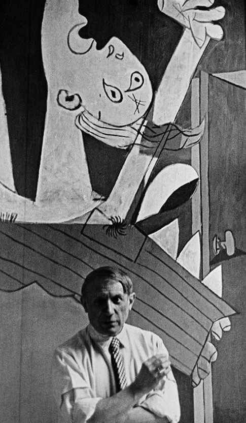 En 1936, il est profondément choqué par le putsch mené par les militaires en Espagne avec à leur tête Franco. Il se rallie aux républicains espagnols et va se voir confier la réalisation d’une fresque pour le pavillon espagnol de l’Exposition Universelle de Paris prévue en 1937. En mars 1937, il apprend par la presse que « 1000 bombes incendiaires lancées par les avions de Hitler et de Mussolini ont réduite en cendres la ville de Guernica en Catalogne, tuant de nombreux civils ». Cet évènement conduira Picasso à réaliser le tableau « Guernica » dans lequel il exprime sa haine de la classe militaire qui vient de plonger l’Espagne dans la douleur et la mort. Ce tableau noir et blanc nous montre une scène de massacre éclairée par un soleil : l’œil du peintre, une bougie : pourquoi tout cela ? et, un peu d’espoir, avec une fleur et une colombe bien cachées. Ce tableau deviendra un chef d’œuvre symbolique, un cri pour exprimer la détresse universelle.