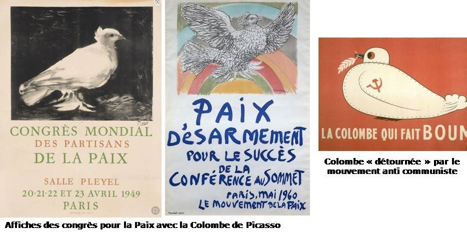 En février 1949, un Congres mondial pour la Paix, soutenu par le Mouvement mondial des partisans de la Paix, et de nombreuses organisations communistes se tient à la salle Pleyel à Paris. Louis Aragon, l’un des organisateurs de l’événement s’adresse à son ami Pablo Picasso, pour lui demander un dessin. Picasso trace alors le profil d’une colombe en s’inspirant des pigeons blancs qu’il garde en cage dans son atelier.