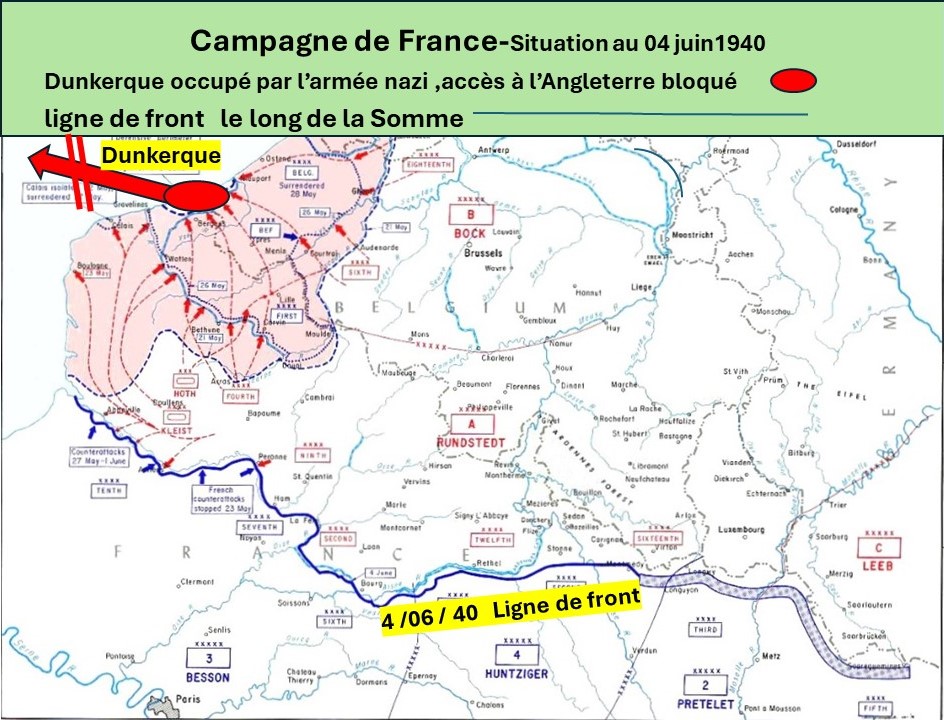 Il vient de profiter de l’opération Dynamo qui, composée de troupes anglaises, commandées par lord Gort, et épaulées par deux divisions françaises dirigées par le vice-amiral Abrial ont transformé Dunkerque en camp retranché et ont permis de sauvegarder l’accès au port de Dunkerque et les plages environnantes pour assurer le retour en Angleterre du corps expéditionnaire anglais.