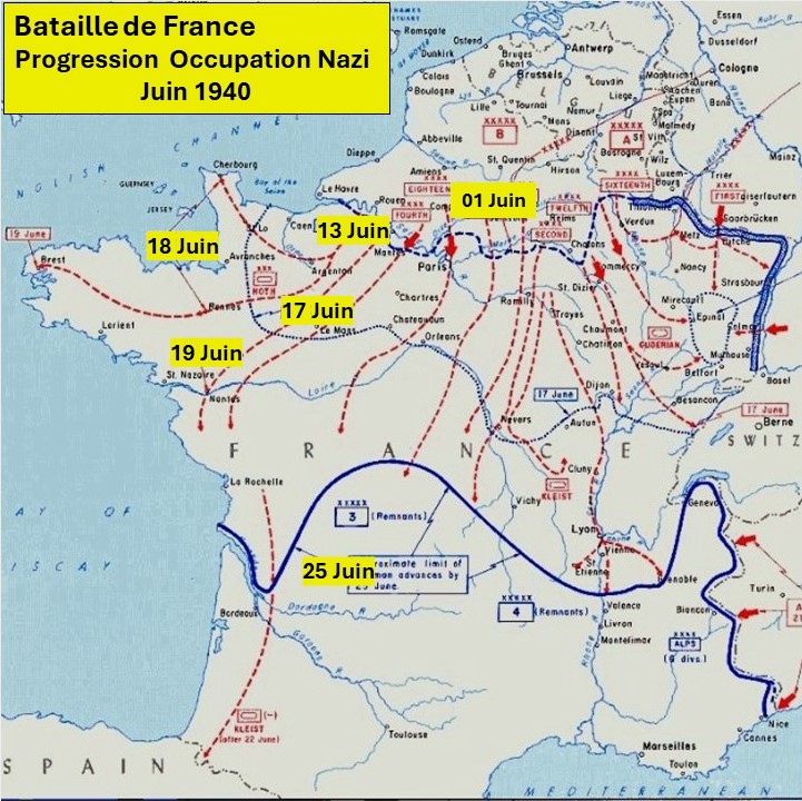 Désormais, les forces nazis se concentrent sur l’invasion vers le sud et le contournement de la ligne Maginot. Début juin les forces alliées tiennent le front le long de la basse Somme et l’Oise .