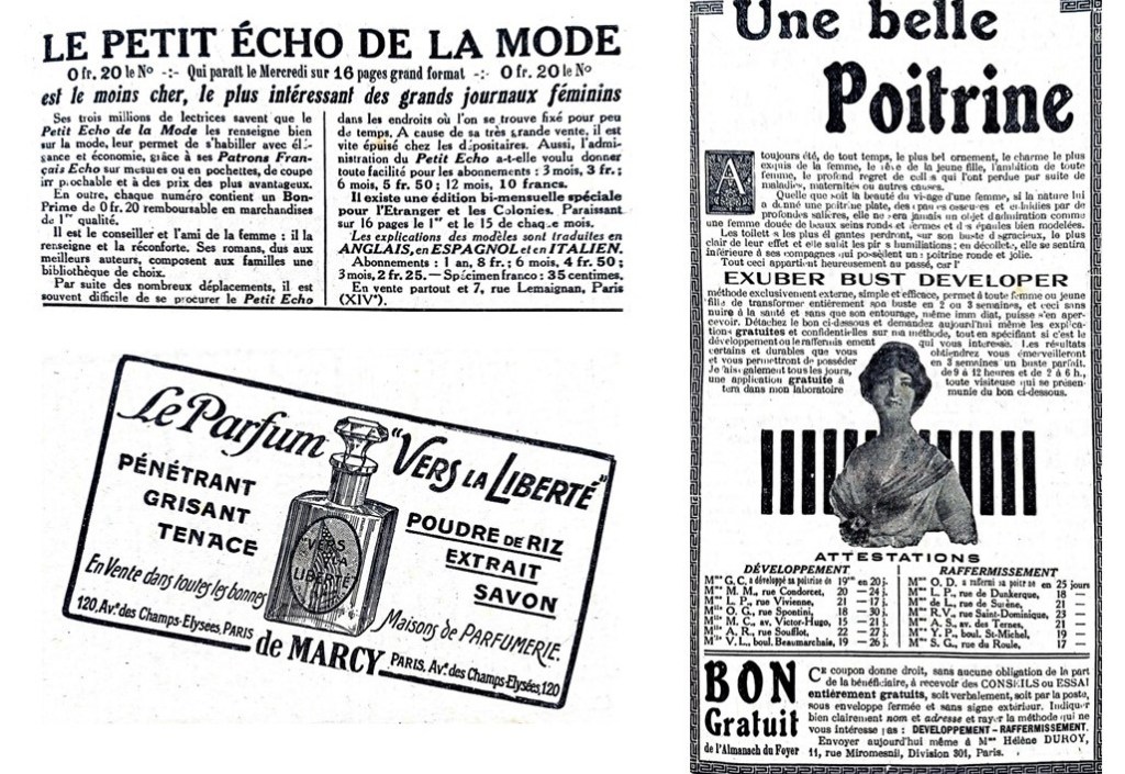 Et c’est pour le Petit Echo de la Mode une satisfaction immense d’avoir, durant ces mois cruels, suivi toutes ses chères lectrices, d’avoir soutenu leur vaillance, d’avoir avivé leur foi patriotique, d’avoir compati à leurs deuils et de les retrouver toujours assidues et constantes aux jours de Victoire. Un lien nouveau rattache le Petit Echo de la Mode à ses fidèles et c’est d’un commun accord qu’ils se préparent à aborder ensemble la tâche nouvelle pour la gloire de la France qui, après avait été l’héroïque nation de guerre, doit être la douce, l’aimable nation de Paix. »