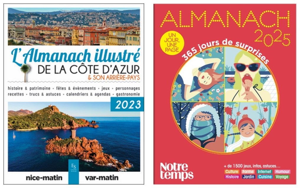 Nous avons ainsi retrouvé : un « Almanach Illustré de la Côte d’Azur » datant de 2023 et un « Almanach 2025 »: un jour, une page, diffusé par le magazine Notre Temps.
