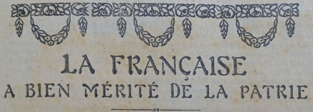 Sa tâche était rude, privée de l’appui viril, elle demeurait seule devant une situation grave ; ce n’était pas seulement au foyer qu’il fallait remplacer l’absent, mais encore dans toutes les branches de l’activité nationale, intensifiée pour répondre aux exigences de la bataille……………………