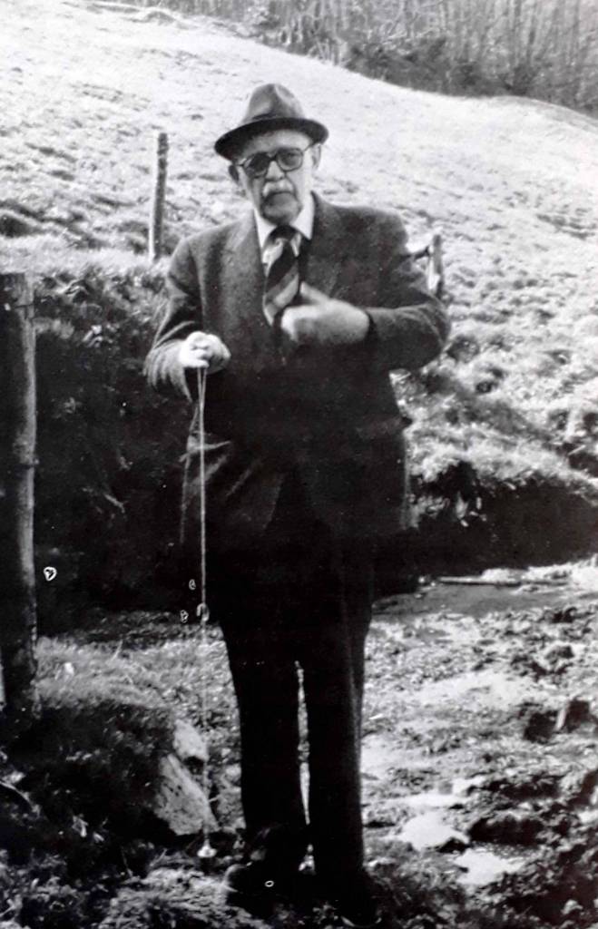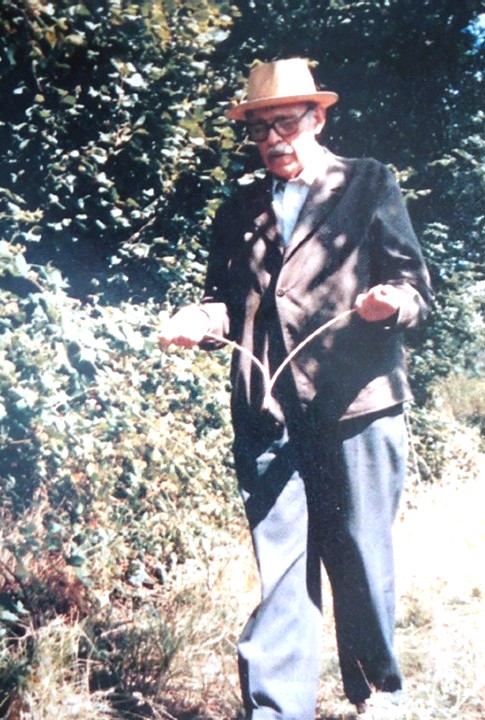 Intrigué, je lui demande de préciser ; il demandait bien des “baguettes de sourcier”. Puis il ajoute « Vous n’en avez pas, mais ne vous en faites pas, il y a ce qu’il faut au verger ». En effet il se dirige aussitôt au fond du jardin, repère un noisetier et coupe deux branches de 50 centimètres en forme de V. Il prend l’attitude du sourcier avec le V, pointe en avant, et parcourt la pelouse à pas lent en partant des regards des fosses septiques. En moins de 10 minutes, après deux parcours dans des directions perpendiculaires, il a effectivement localisé les circuits de drainage puis les fosses septiques.